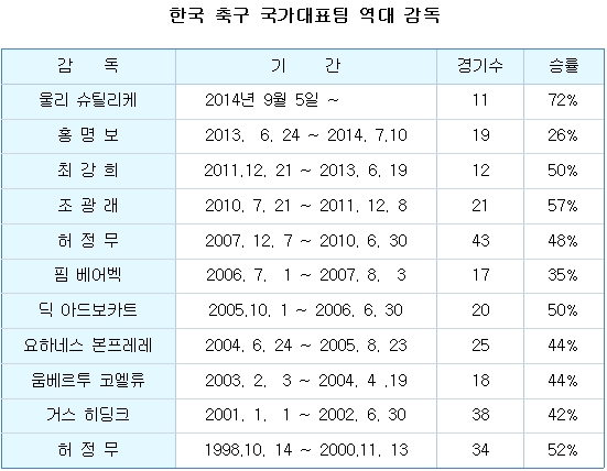 ¡ã ´ëÇѹα¹Àº Áö³ 2002³â °Å½º È÷µùÅ© °¨µ¶À» ÀÓ¿ëÇÏ¸é¼ ¿ùµåÄÅ 4°ÀÇ ±âÀûÀ» ¸ÀºÃ´Ù. ÀÌÈÄ 4¸íÀÇ ¿Ü±¹ÀÎ °¨µ¶ÀÌ Ã౸±¹°¡´ëÇ¥ÆÀÀÇ ÁöÈÖºÀÀ» Àâ¾ÒÁö¸¸ º°´Ù¸¥ ¼º°ú ¾øÀÌ ÀÚ¸®¿¡¼ ¹°·¯³µ´Ù. ÇÏÁö¸¸ Áö³ÇØ 9¿ù ºÎÀÓÇÑ ¿ï¸® ½´Æ¿¸®ÄÉ °¨µ¶Àº ´Þ¶ú´Ù. ½´Æ¿¸®ÄÉ °¨µ¶Àº ¾Æ½Ã¾ÈÄÅ¿¡¼ Çѱ¹ÆÀÀ» 27³â¸¸¿¡ ÁØ¿ì½ÂÀ¸·Î À̲ø¸é¼ ÆÒµéÀÇ È¯È£¸¦ ¹Þ¾Ò´Ù. [»çÁø=´º½Ã½º]